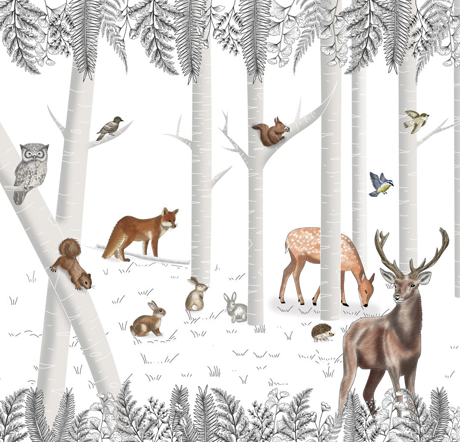 Una foresta da favola e animali perfettamente illustrati per una camera da letto da sogno.