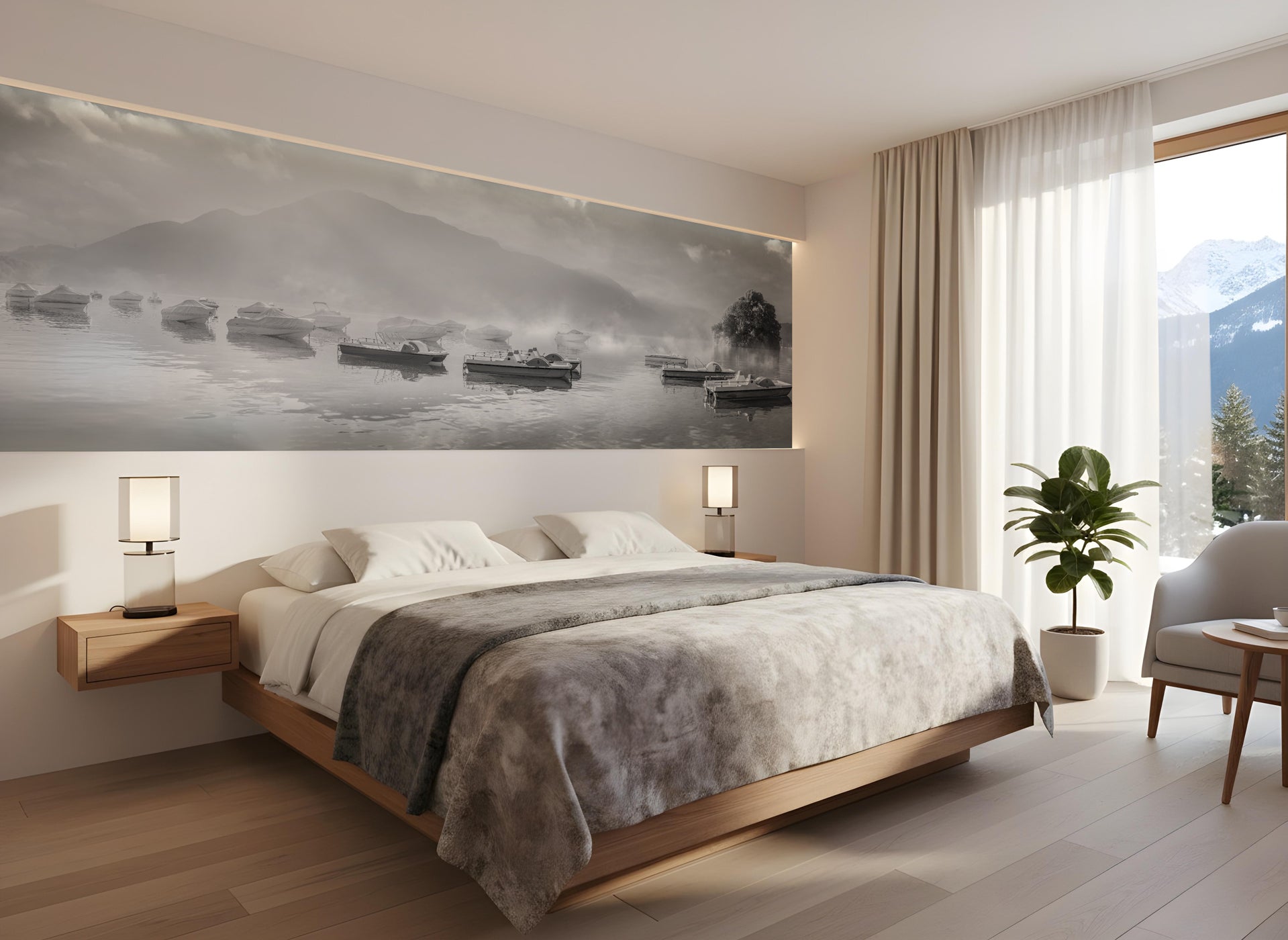 Con la nostra carta da parati panoramica Mattinata al lago di Annecy, avvicinatevi alla natura. Questa carta da parati panoramica sublimerà i vostri interni. Il panorama del lago di Annecy, la sua leggera foschia e le sue emblematiche imbarcazioni aggiungono un tocco artistico.