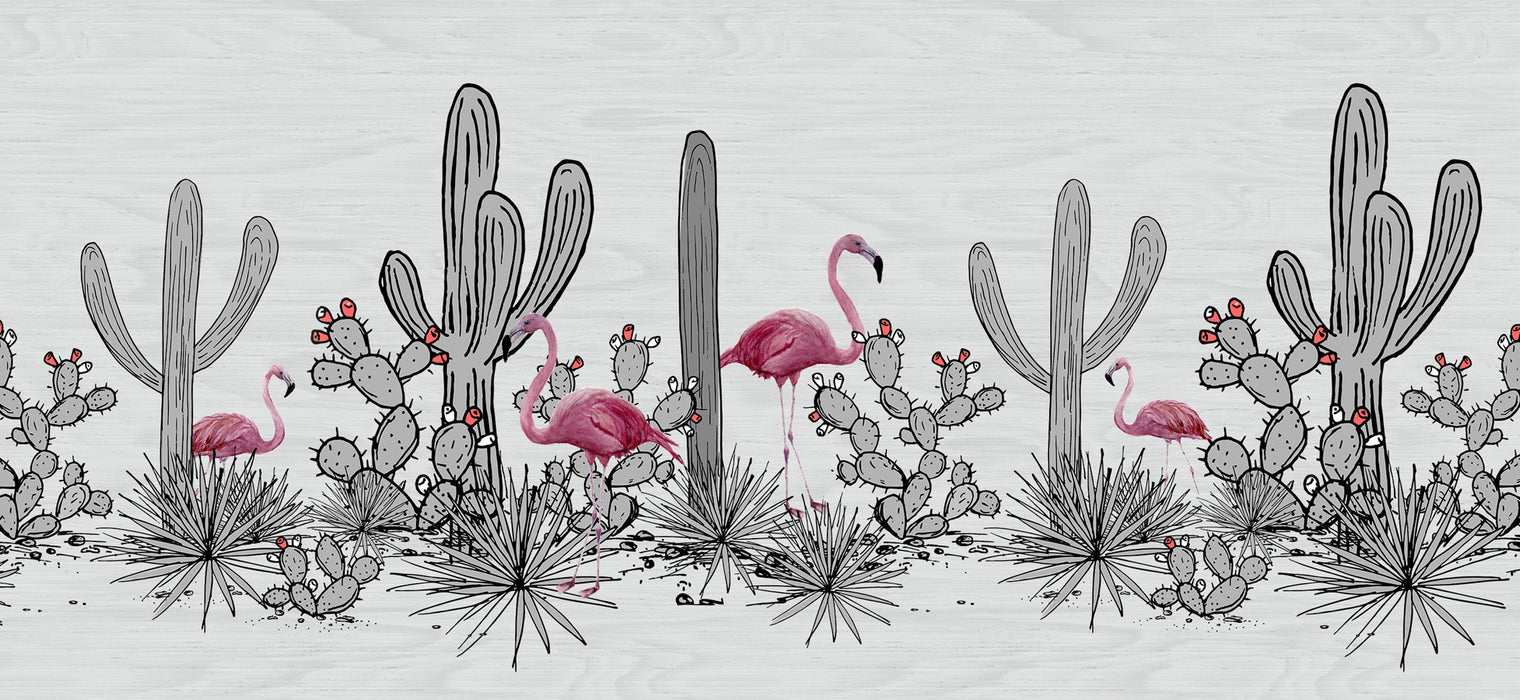 Carta da parati panoramica per bagno con cactus e fenicotteri rosa