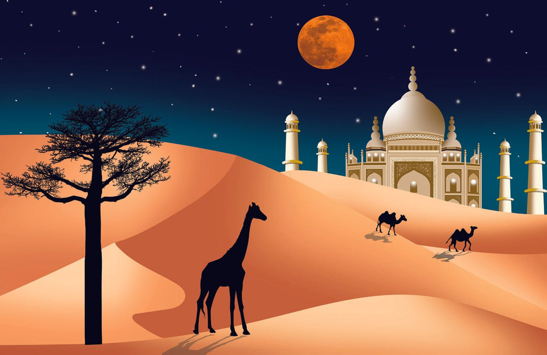 Il murale Mille e una notte nel Sahara vi ipnotizzerà e vi aiuterà a creare un'atmosfera favorevole al relax. Date alla vostra casa un aspetto trendy, elegante e unico con questa carta da parati panoramica artistica che stupirà i vostri amici! Questa carta da parati panoramica valorizzerà qualsiasi stanza della vostra casa e sarà l'elemento principale del vostro arredamento. Create facilmente un interno da sogno con il nostro arazzo murale realizzato in base alle dimensioni della vostra parete.