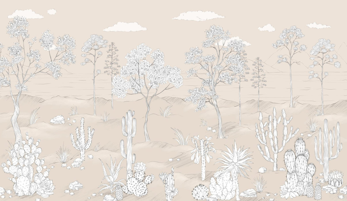Trasformate i vostri interni con la nostra carta da parati oasi di cactus tropicale. Ispirata al Messico, in particolare alla città di Oaxaca, questa carta da parati panoramica valorizza in modo discreto qualsiasi arredamento. Questa carta da parati tropicale è una carta da parati su misura che si adatta ovunque grazie alle sue tonalità chiare di beige e ai suoi delicati motivi di cactus e vegetazione. Osate una nuova decorazione murale originale ed elegante con la nostra nuova carta da parati panoramica cactus.