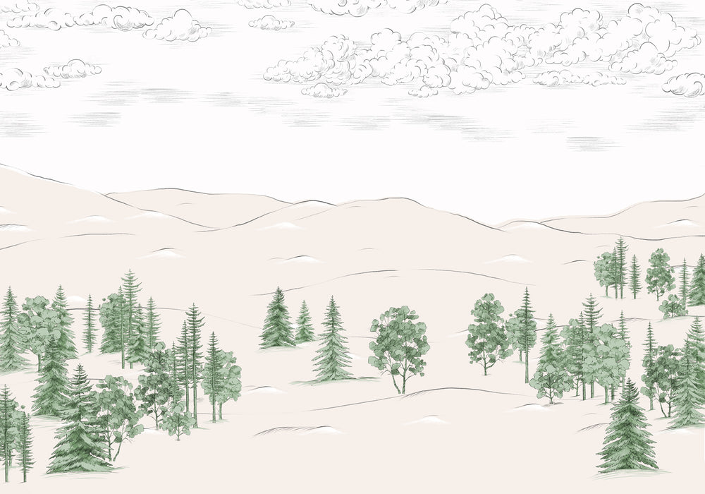 Immergetevi nell'incantevole atmosfera delle vette con la nostra carta da parati panoramica "Esquisse des Cimes" in versione bicolore verde bosco e beige in lino. Questa creazione francese, realizzata con cura e passione, cattura la maestosità delle montagne con disegni a matita di alberi, faggi e nuvole che si intrecciano nei toni del beige e del verde bosco.