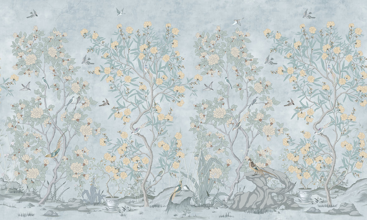 Questa carta da parati a cineserie rappresenta una decorazione vegetale e floreale, con colori tenui e pastello. Gli uccelli accompagnano questo quadro per aggiungere morbidezza e originalità.