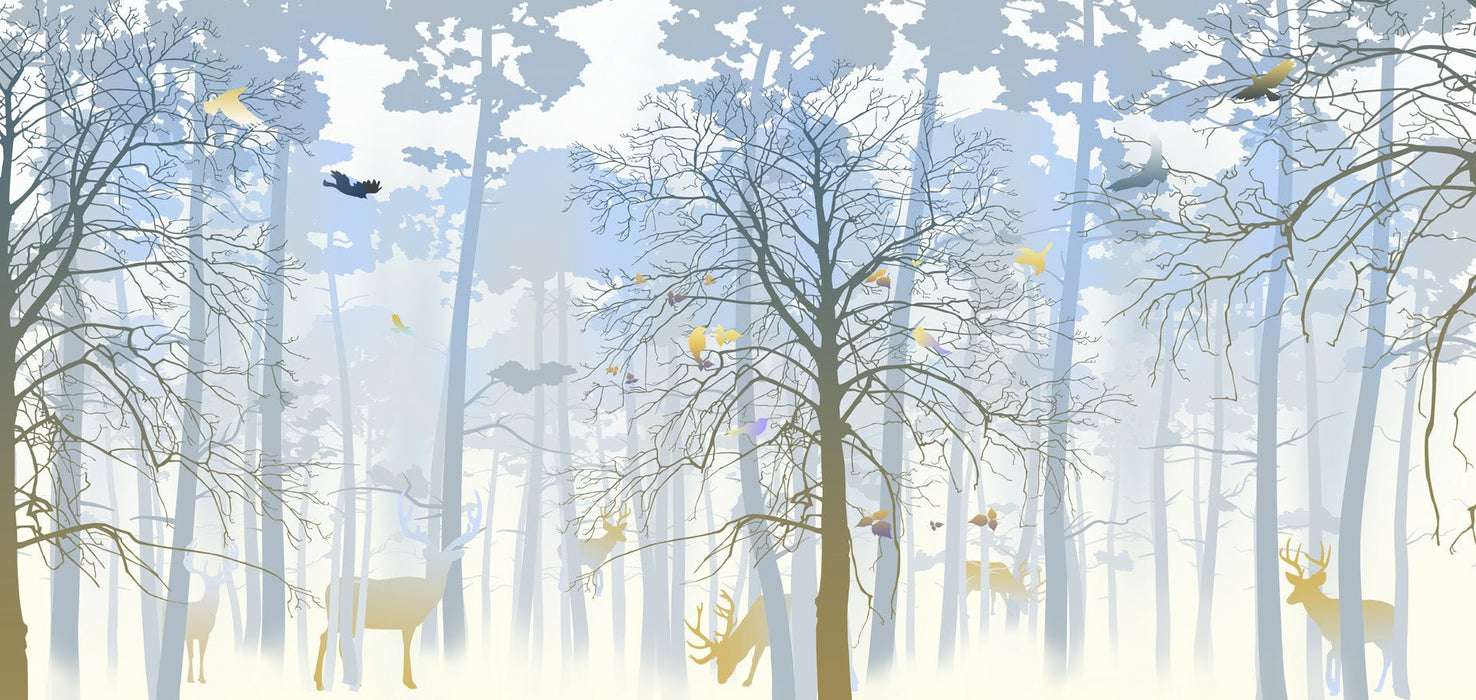 Esclusiva collezione di carta da parati panoramica in tessuto non tessuto con aspetto di foresta, cervo e cerbiatto.