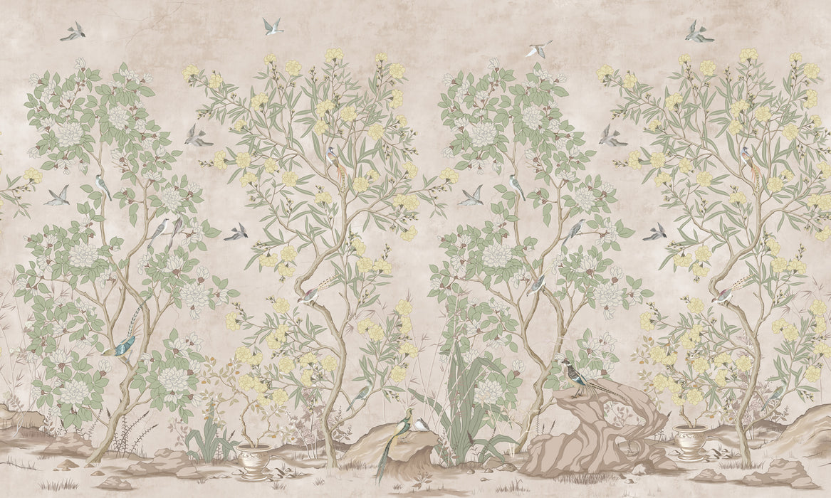 Questa carta da parati a cineserie rappresenta una decorazione vegetale e floreale, con colori tenui e pastello. Gli uccelli accompagnano questo quadro per aggiungere morbidezza e originalità.