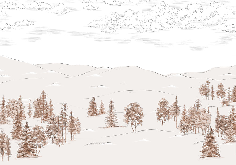 Immergetevi nell'incantevole atmosfera delle vette con la nostra carta da parati panoramica "Esquisse des Cimes" nei caldi colori SEPIA. Questa creazione francese, realizzata con cura e passione, cattura la maestosità delle montagne con disegni a matita di alberi, faggi e nuvole che si intrecciano nei toni del beige e del verde bosco.