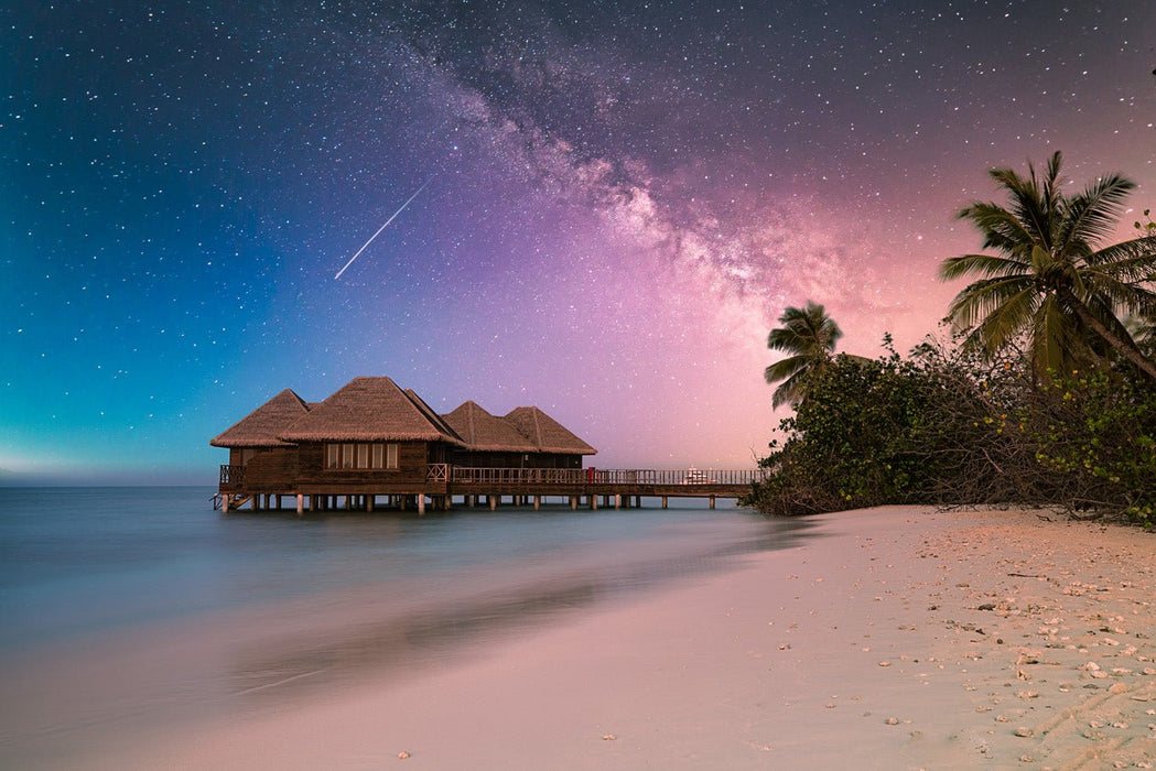 Lasciatevi trasportare in paradiso con questo sfondo fotografico da favola sulla spiaggia. Suggestivo ed esotico, questo sfondo panoramico offre una vista eccezionale e artistica di una spiaggia dell'Oceano Indiano, di una palafitta e di palme.