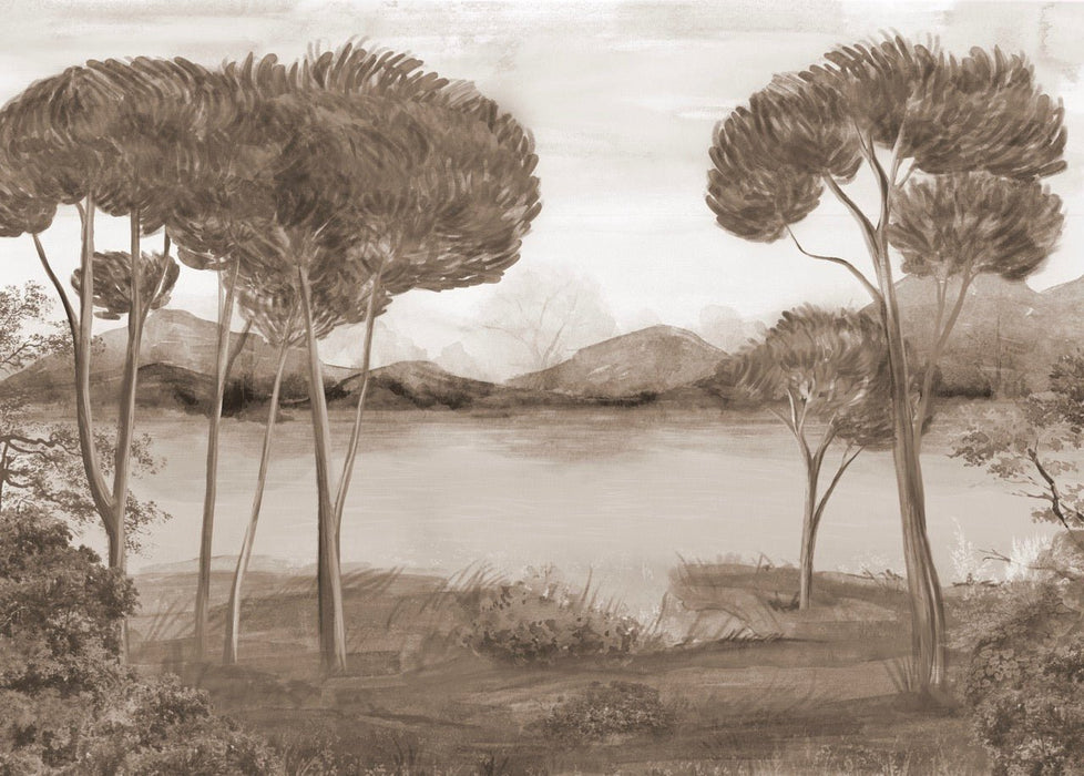 Immergete i vostri interni in un'eleganza senza tempo con questa carta da parati panoramica color seppia, ispirata ai paesaggi mediterranei. Slanciati pini marittimi si ergono sulle rive di un tranquillo lago, in uno stile pittorico raffinato che evoca gli antichi affreschi italiani.