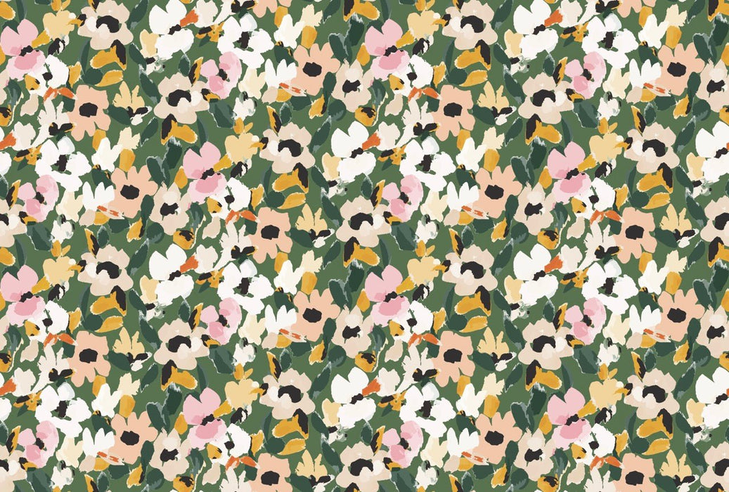 Ce papier peint motif fleurs se distingue par son style dense et artistique, mêlant des nuances de vert profond, beige, rose et ocre pour créer une ambiance dynamique et élégante. Idéal pour une chambre moderne, une entrée, un espace professionnel il permet de créer un mur fort en caractère, notamment en tête de lit.