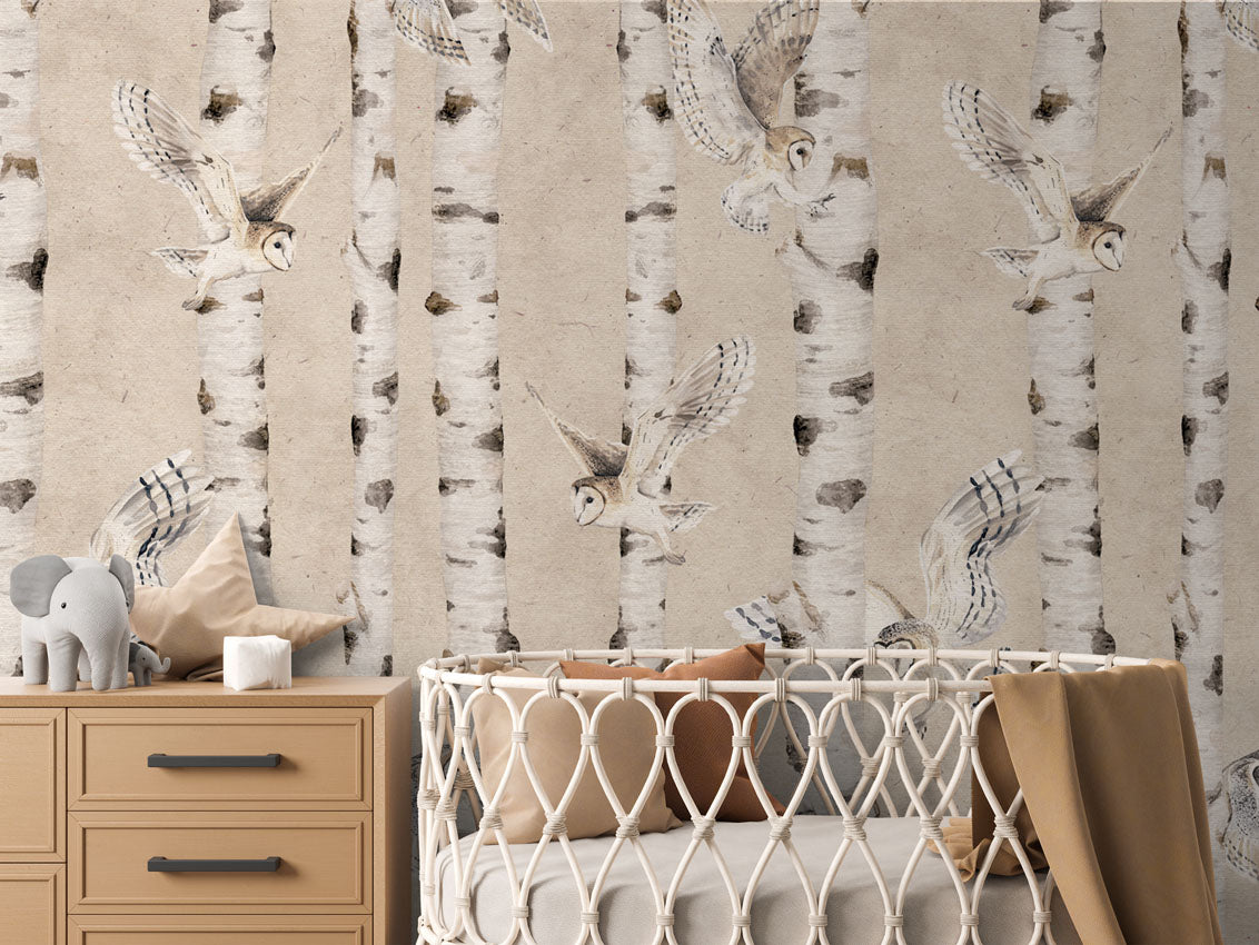 Papier peint enfant - chouettes & bouleaux