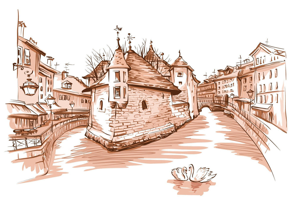 Passeggiate con la vostra decorazione murale intorno al Palais de l'Isle d'Annecy, un monumento storico classificato spesso descritto come una "casa a forma di galea". Passeggiate lungo le rive del Thiou, accanto al lago di Annecy, al suo Pâquier e all'atmosfera del centro storico di Annecy. Questo magnifico murale si ispira alla tranquilla bellezza di Annecy, soprannominata la Venezia delle Alpi.