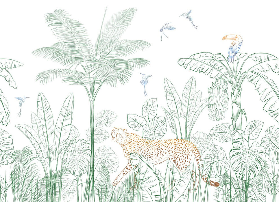 Un tocco selvaggio ma contemporaneo con la nostra carta da parati leopardata verde della giungla. Un raffinato motivo jungle, disegnato con linee verdi, rivisitato per portare chic e raffinatezza ai vostri interni. La carta da parati in stile giungla è ideale per camere da letto, soggiorni e ingressi. Con questo murale creerete un'atmosfera tropicale. Questo murale jungle si abbina perfettamente a oggetti decorativi in legno, rattan e bambù.