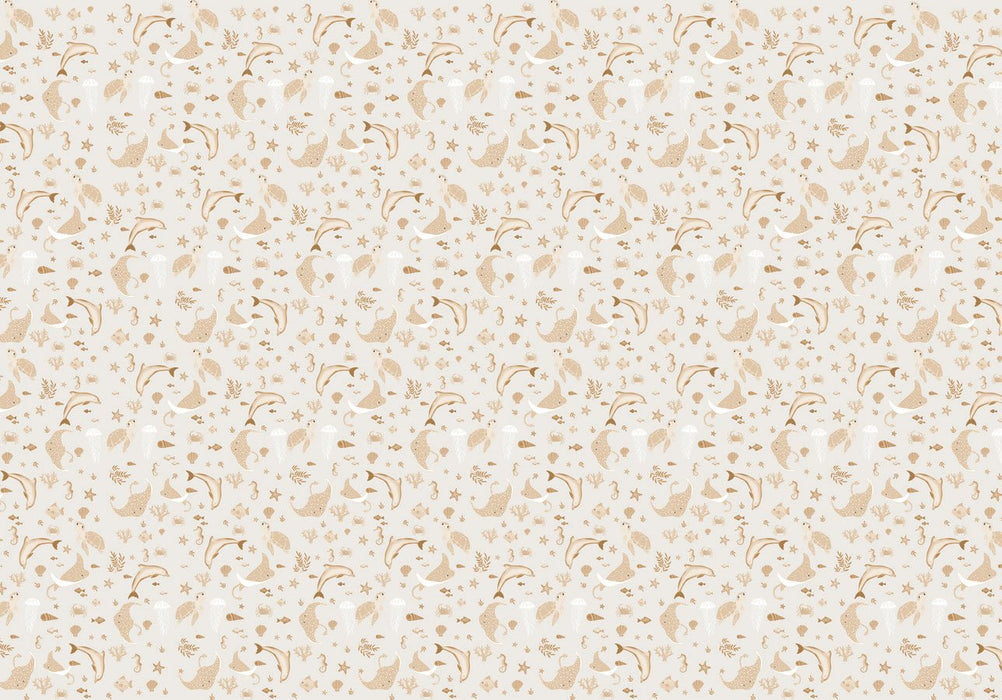 Scegliete la carta da parati oceania gold per decorare la cameretta del vostro bambino. Una carta da parati panoramica con motivi marini, per bambini esploratori. I colori tenui e pastello di questa carta da parati su misura in tessuto non tessuto si adattano perfettamente all'atmosfera della cameretta del bambino.
