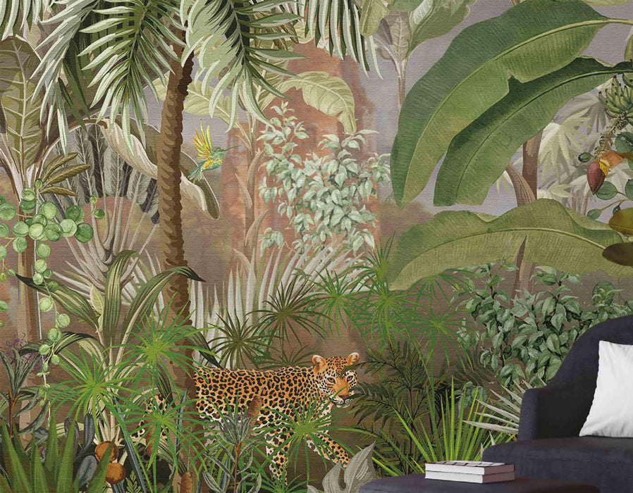 Carta da parati panoramica con giungla e leopardo