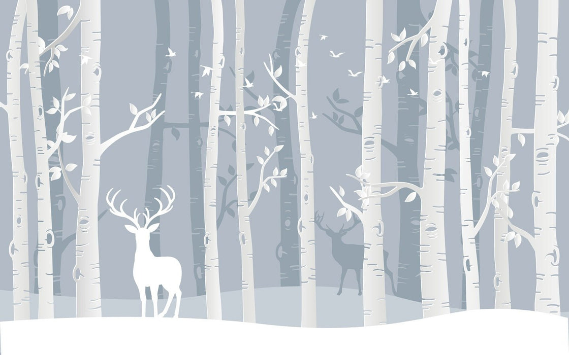 Carta da parati per bambini della foresta scandinava di betulle e cervi