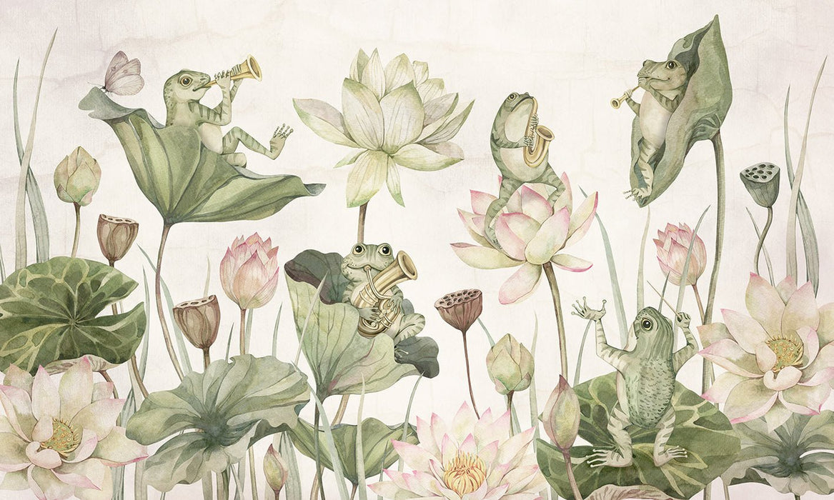 La cameretta del vostro bambino sarà elettrizzante con questa carta da parati con rane musicali! Questa carta da parati per bambini presenta simpatiche rane che fanno musica tra fiori e ninfee. Grazie ai suoi tenui colori pastello, questa carta da parati dinamica tranquillizzerà il vostro bambino durante il pisolino o il riposo. Ideale per la cameretta del bambino, questa decorazione murale risveglia i suoi sensi e sviluppa le sue facoltà sensoriali.