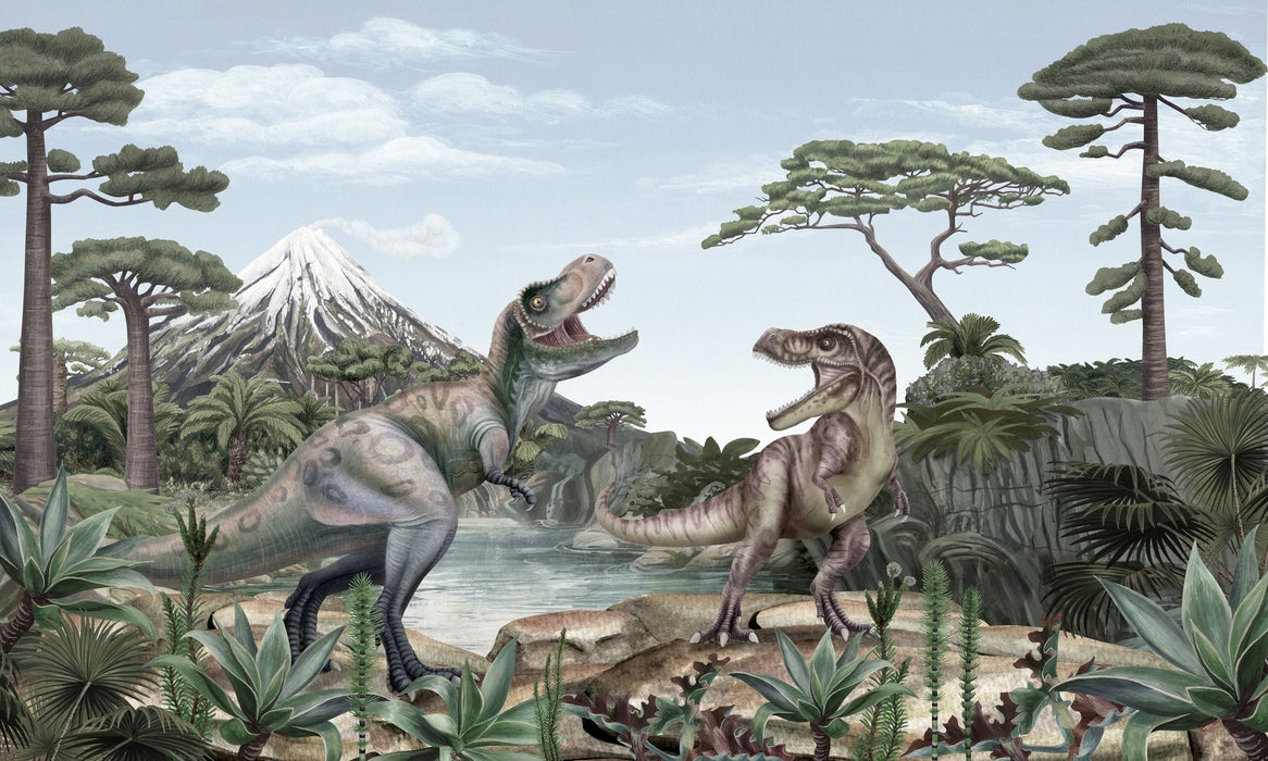 Questa carta da parati su misura raffigura due dinosauri, la famiglia dei t-rex, che si danno da fare nella foresta. Sullo sfondo, troverete vegetazione, un lago e una montagna, per un'immersione completa in questo universo.