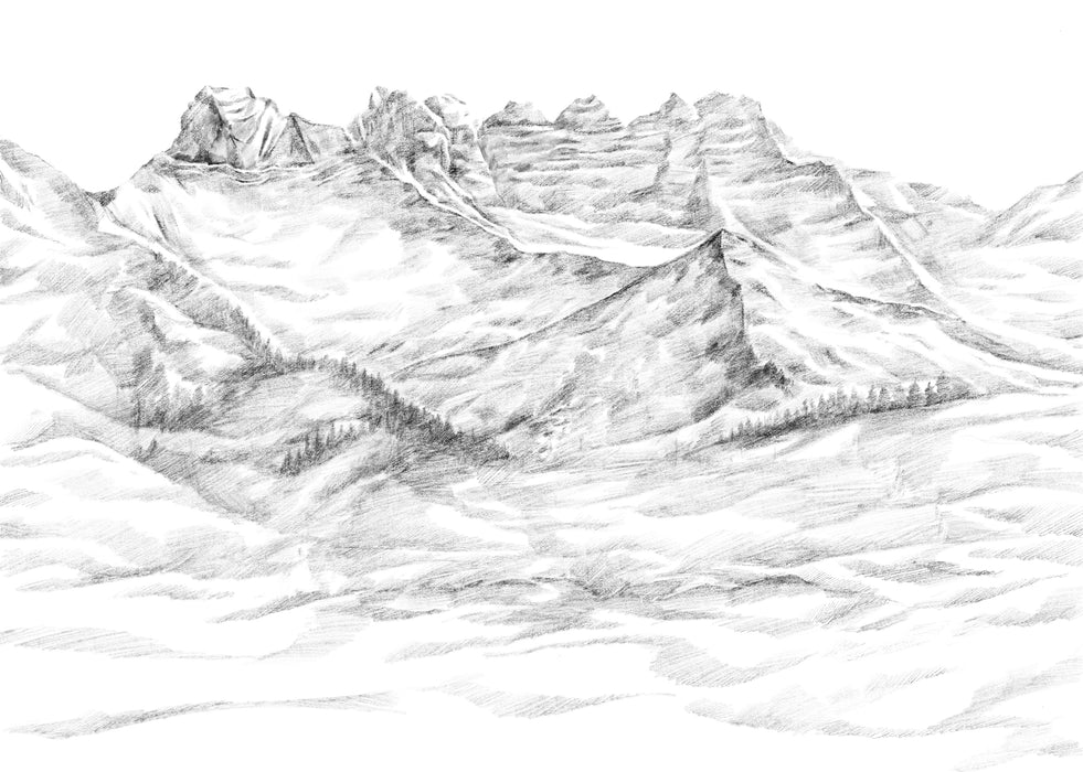 Stile: carta da parati montagna in bianco e nero, disegno artistico a matita