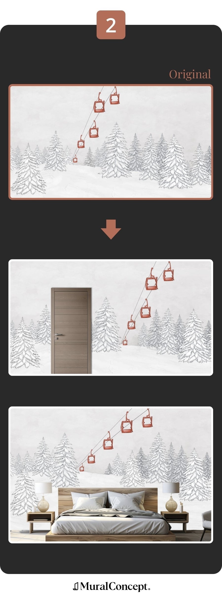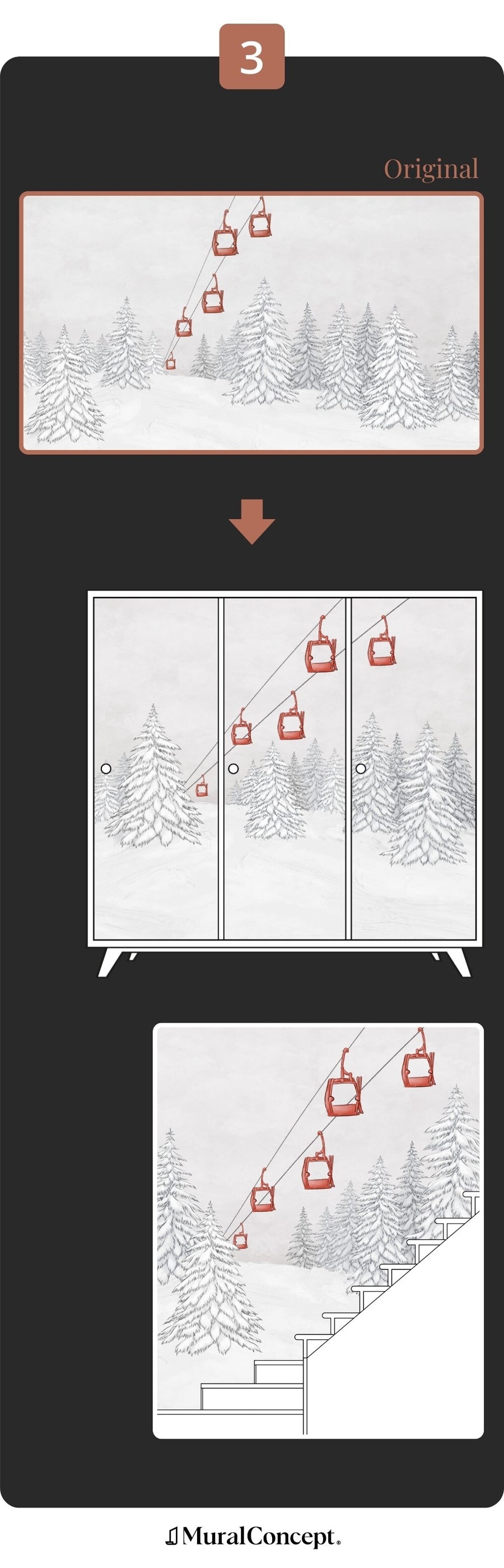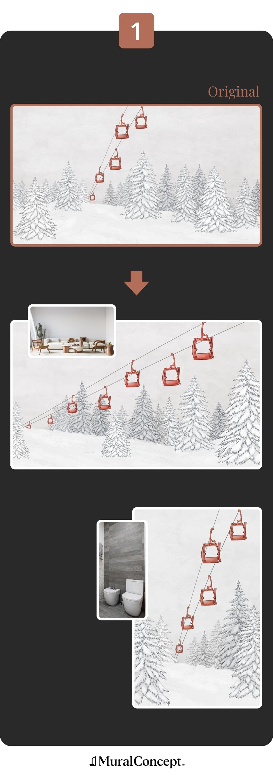 Misurate l'altezza e la larghezza maggiore della parete e inserite i valori in centimetri nel calcolatore. Con l'opzione di personalizzazione grafica, lo studio di design adatterà l'arredamento alle dimensioni della parete per un risultato al 100% su misura.