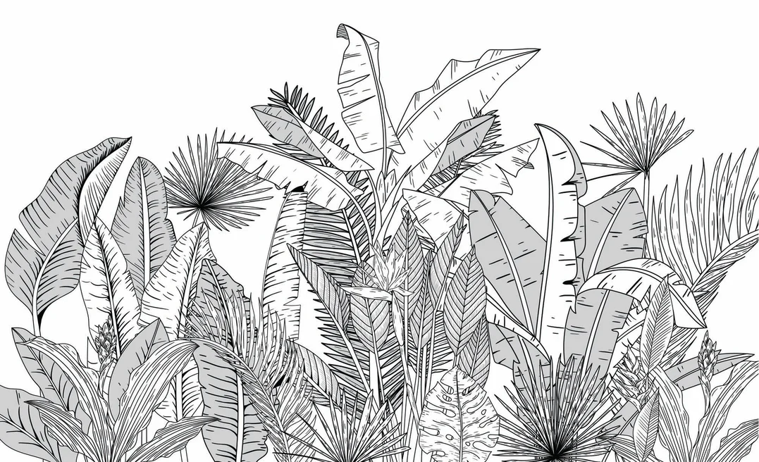 Carta da parati panoramica in bianco e nero con foglie botaniche