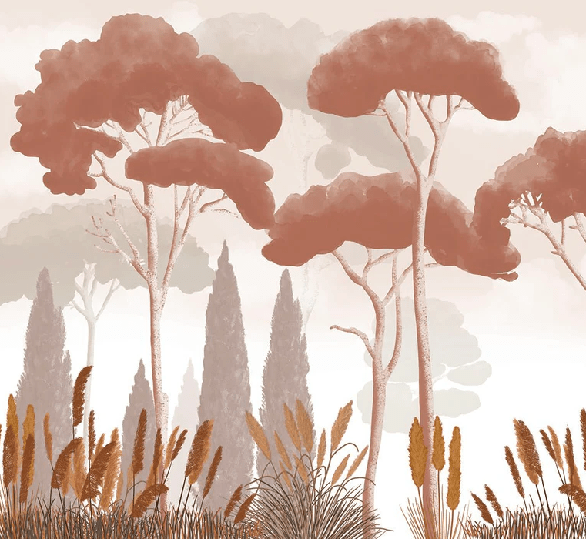 Papier peint cyprès pins et herbes de la pampa terracotta